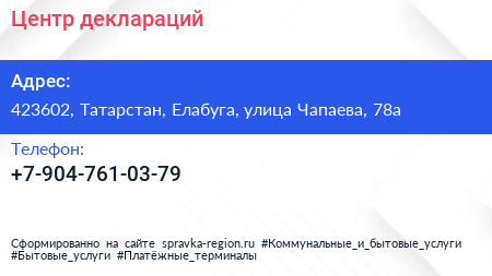 Центр деклараций по адресу 423602, Татарстан, Елабуга, улица Чапаева, 78а в дальнейшем Организация, размещена в следующих категориях:
