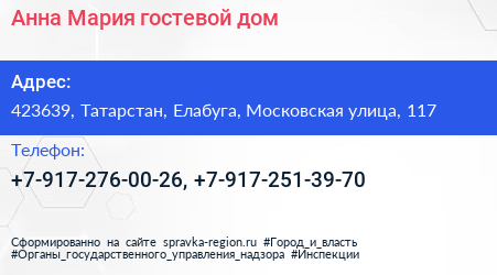 Анна-Мария, гостевой дом по адресу 423639, Татарстан, Елабуга, Московская улица, 117 в дальнейшем Организация, размещена в следующих категориях: