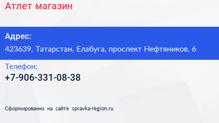 Атлет, магазин по адресу 423639, Татарстан, Елабуга, проспект Нефтяников, 6 в дальнейшем Организация, размещена в следующих категориях: