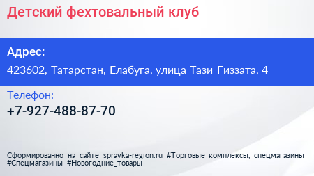 Детский фехтовальный клуб по адресу 423602, Татарстан, Елабуга, улица Тази Гиззата, 4 в дальнейшем Организация, размещена в следующих категориях: