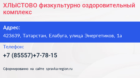 ХЛЫСТОВО, физкультурно-оздоровительный комплекс по адресу 423639, Татарстан, Елабуга, улица Энергетиков, 1а в дальнейшем Организация, размещена в следующих категориях: