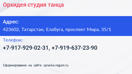 Орхидея, студия танца по адресу 423602, Татарстан, Елабуга, проспект Мира, 35/1 в дальнейшем Организация, размещена в следующих категориях: