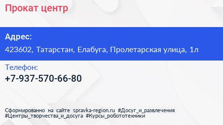 Прокат-центр по адресу 423602, Татарстан, Елабуга, Пролетарская улица, 1л в дальнейшем Организация, размещена в следующих категориях: