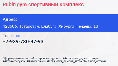 Rubin gym, спортивный комплекс по адресу 423606, Татарстан, Елабуга, Хирурга Нечаева, 13 в дальнейшем Организация, размещена в следующих категориях: