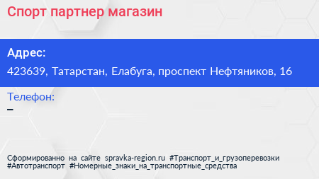 Спорт партнер, магазин по адресу 423639, Татарстан, Елабуга, проспект Нефтяников, 16 в дальнейшем Организация, размещена в следующих категориях: