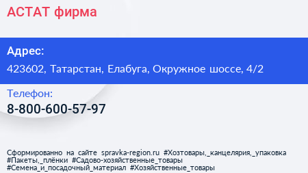 АСТАТ, фирма по адресу 423602, Татарстан, Елабуга, Окружное шоссе, 4/2 в дальнейшем Организация, размещена в следующих категориях: