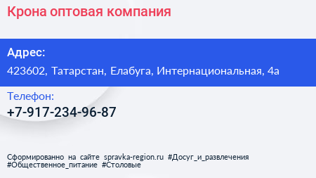 Крона, оптовая компания по адресу 423602, Татарстан, Елабуга, Интернациональная, 4а в дальнейшем Организация, размещена в следующих категориях:
