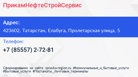 ПрикамНефтеСтройСервис по адресу 423602, Татарстан, Елабуга, Пролетарская улица, 5 в дальнейшем Организация, размещена в следующих категориях: