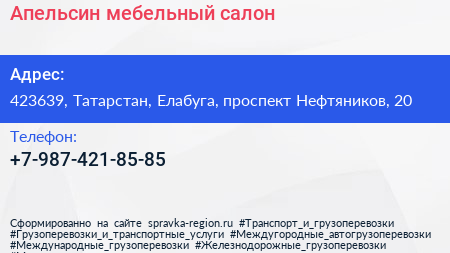 Апельсин, мебельный салон по адресу 423639, Татарстан, Елабуга, проспект Нефтяников, 20 в дальнейшем Организация, размещена в следующих категориях: