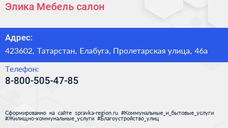 Элика Мебель, салон по адресу 423602, Татарстан, Елабуга, Пролетарская улица, 46а в дальнейшем Организация, размещена в следующих категориях: