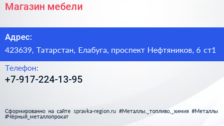 Магазин мебели по адресу 423639, Татарстан, Елабуга, проспект Нефтяников, 6 ст1 в дальнейшем Организация, размещена в следующих категориях: