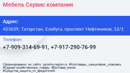 Мебель-Сервис, компания по адресу 423639, Татарстан, Елабуга, проспект Нефтяников, 12/1 в дальнейшем Организация, размещена в следующих категориях: