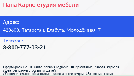 Папа Карло, студия мебели по адресу 423603, Татарстан, Елабуга, Молодёжная, 7 в дальнейшем Организация, размещена в следующих категориях: