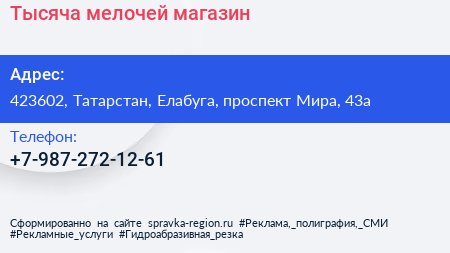 Тысяча мелочей, магазин по адресу 423602, Татарстан, Елабуга, проспект Мира, 43а в дальнейшем Организация, размещена в следующих категориях: