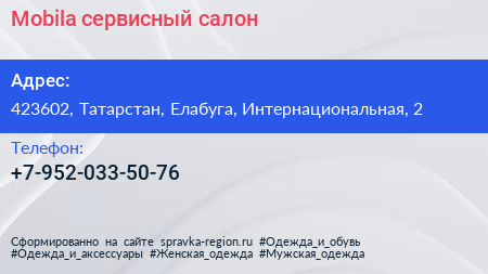 Mobila, сервисный салон по адресу 423602, Татарстан, Елабуга, Интернациональная, 2 в дальнейшем Организация, размещена в следующих категориях: