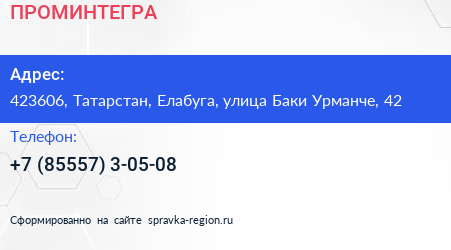 ПРОМИНТЕГРА по адресу 423606, Татарстан, Елабуга, улица Баки Урманче, 42 в дальнейшем Организация, размещена в следующих категориях: