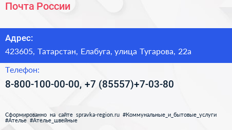 Почта России по адресу 423605, Татарстан, Елабуга, улица Тугарова, 22а в дальнейшем Организация, размещена в следующих категориях: