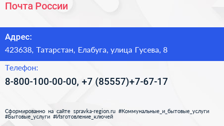 Почта России по адресу 423638, Татарстан, Елабуга, улица Гусева, 8 в дальнейшем Организация, размещена в следующих категориях: