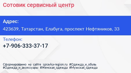 Сотовик, сервисный центр по адресу 423639, Татарстан, Елабуга, проспект Нефтяников, 33 в дальнейшем Организация, размещена в следующих категориях:
