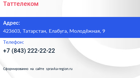 Таттелеком по адресу 423603, Татарстан, Елабуга, Молодёжная, 9 в дальнейшем Организация, размещена в следующих категориях: