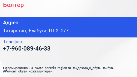 Болтер по адресу Татарстан, Елабуга, Ш-2, 2/7 в дальнейшем Организация, размещена в следующих категориях: