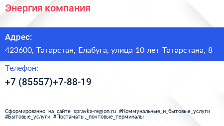Энергия, компания по адресу 423600, Татарстан, Елабуга, улица 10 лет Татарстана, 8 в дальнейшем Организация, размещена в следующих категориях: