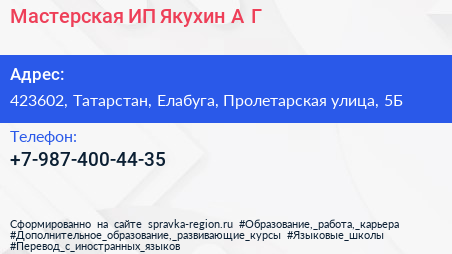 Мастерская, ИП Якухин А.Г. по адресу 423602, Татарстан, Елабуга, Пролетарская улица, 5Б в дальнейшем Организация, размещена в следующих категориях:
