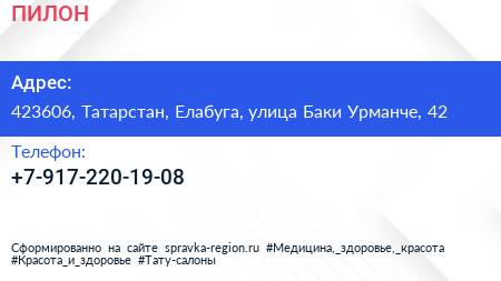 ПИЛОН по адресу 423606, Татарстан, Елабуга, улица Баки Урманче, 42 в дальнейшем Организация, размещена в следующих категориях: