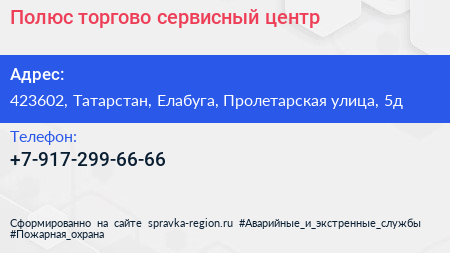 Полюс, торгово-сервисный центр по адресу 423602, Татарстан, Елабуга, Пролетарская улица, 5д в дальнейшем Организация, размещена в следующих категориях: