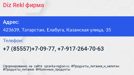 Diz-Rekl, фирма по адресу 423639, Татарстан, Елабуга, Казанская улица, 35 в дальнейшем Организация, размещена в следующих категориях: