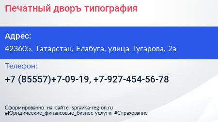 Печатный дворъ, типография по адресу 423605, Татарстан, Елабуга, улица Тугарова, 2а в дальнейшем Организация, размещена в следующих категориях: