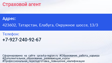 Страховой агент по адресу 423602, Татарстан, Елабуга, Окружное шоссе, 13/3 в дальнейшем Организация, размещена в следующих категориях: