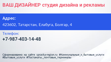 ВАШ ДИЗАЙНЕР, студия дизайна и рекламы по адресу 423602, Татарстан, Елабуга, Болгар, 4 в дальнейшем Организация, размещена в следующих категориях: