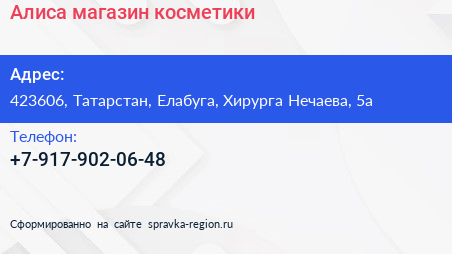 Алиса, магазин косметики по адресу 423606, Татарстан, Елабуга, Хирурга Нечаева, 5а в дальнейшем Организация, размещена в следующих категориях: