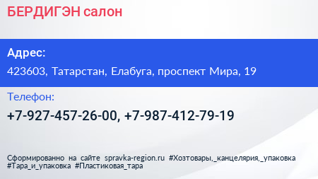 БЕРДИГЭН, салон по адресу 423603, Татарстан, Елабуга, проспект Мира, 19 в дальнейшем Организация, размещена в следующих категориях: