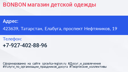 BONBON, магазин детской одежды по адресу 423639, Татарстан, Елабуга, проспект Нефтяников, 19 в дальнейшем Организация, размещена в следующих категориях: