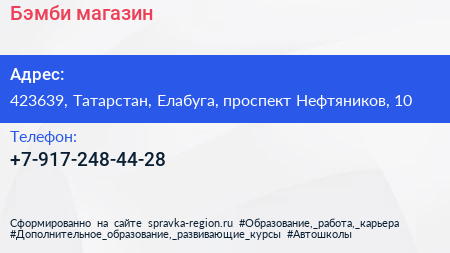 Бэмби, магазин по адресу 423639, Татарстан, Елабуга, проспект Нефтяников, 10 в дальнейшем Организация, размещена в следующих категориях: