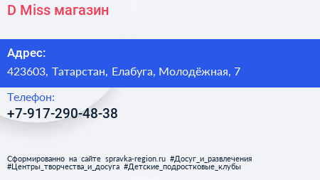 D.Miss, магазин по адресу 423603, Татарстан, Елабуга, Молодёжная, 7 в дальнейшем Организация, размещена в следующих категориях: