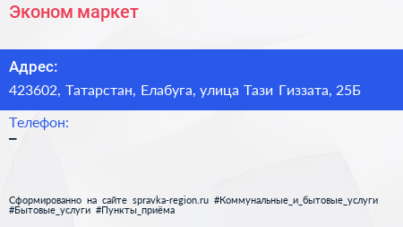 Эконом-маркет по адресу 423602, Татарстан, Елабуга, улица Тази Гиззата, 25Б в дальнейшем Организация, размещена в следующих категориях: