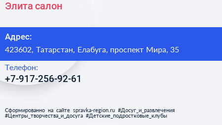 Элита, салон по адресу 423602, Татарстан, Елабуга, проспект Мира, 35 в дальнейшем Организация, размещена в следующих категориях:
