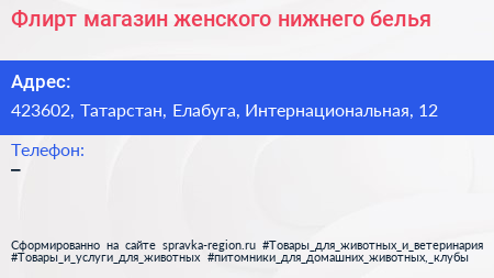 Флирт, магазин женского нижнего белья по адресу 423602, Татарстан, Елабуга, Интернациональная, 12 в дальнейшем Организация, размещена в следующих категориях: