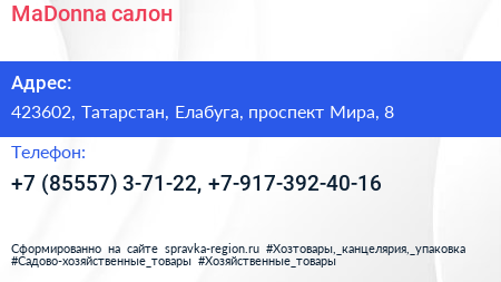 MaDonna, салон по адресу 423602, Татарстан, Елабуга, проспект Мира, 8 в дальнейшем Организация, размещена в следующих категориях: