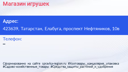 Магазин игрушек по адресу 423639, Татарстан, Елабуга, проспект Нефтяников, 10в в дальнейшем Организация, размещена в следующих категориях: