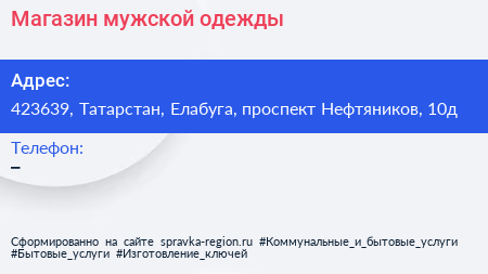 Магазин мужской одежды по адресу 423639, Татарстан, Елабуга, проспект Нефтяников, 10д в дальнейшем Организация, размещена в следующих категориях: