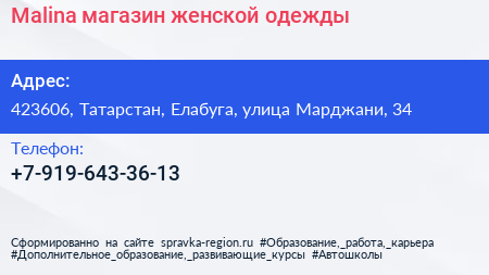 Malina, магазин женской одежды по адресу 423606, Татарстан, Елабуга, улица Марджани, 34 в дальнейшем Организация, размещена в следующих категориях: