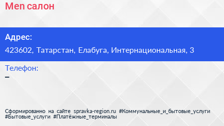 Men, салон по адресу 423602, Татарстан, Елабуга, Интернациональная, 3 в дальнейшем Организация, размещена в следующих категориях: