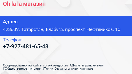Oh-la-la!, магазин по адресу 423639, Татарстан, Елабуга, проспект Нефтяников, 10 в дальнейшем Организация, размещена в следующих категориях: