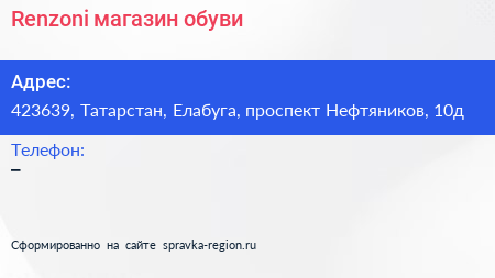Renzoni, магазин обуви по адресу 423639, Татарстан, Елабуга, проспект Нефтяников, 10д в дальнейшем Организация, размещена в следующих категориях: