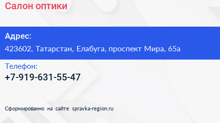 Салон оптики по адресу 423602, Татарстан, Елабуга, проспект Мира, 65а в дальнейшем Организация, размещена в следующих категориях: