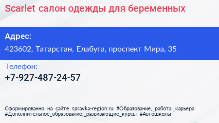 Scarlet, салон одежды для беременных по адресу 423602, Татарстан, Елабуга, проспект Мира, 35 в дальнейшем Организация, размещена в следующих категориях: